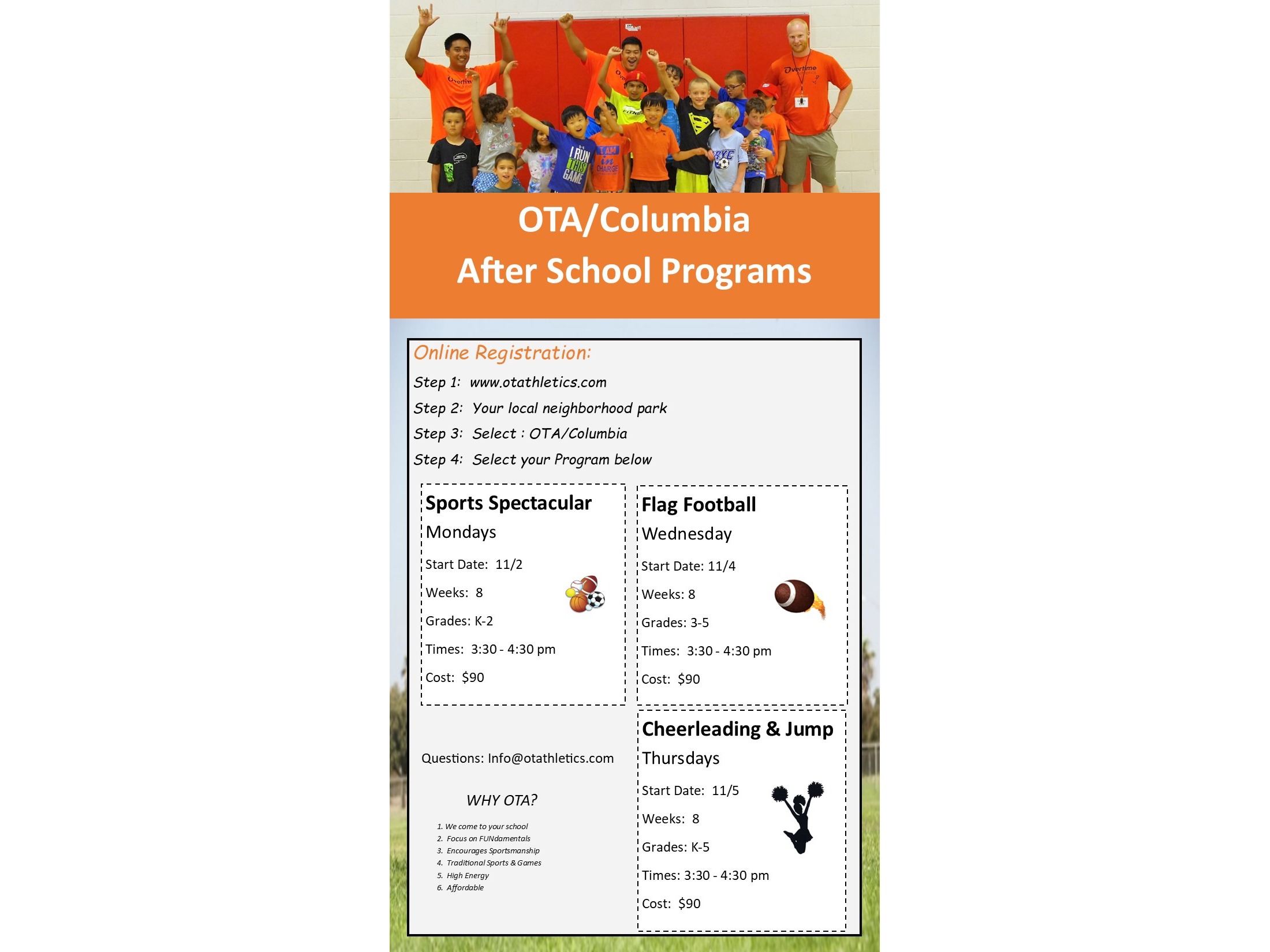 Huddle Up and get ready for Flag Football to become an instant classic. Kids are lining up to score touchdowns and get a taste of the most popular game in the country! Players will get a chance to be running backs, wide receivers, defensive ends, and corner backs. Learn to pass, catch, run routes and punt like the pros! We'll practice these skills while playing Button Hook, Down & Out, Pitch & Run and First & Ten. Scrimmages and Red Zone Challenges will test your skills, promote teamwork and encourage sportsmanship. ARE YOU READY FOR SOME FLAG FOOTBALL!? Sign up today and score a touchdown with OTA!