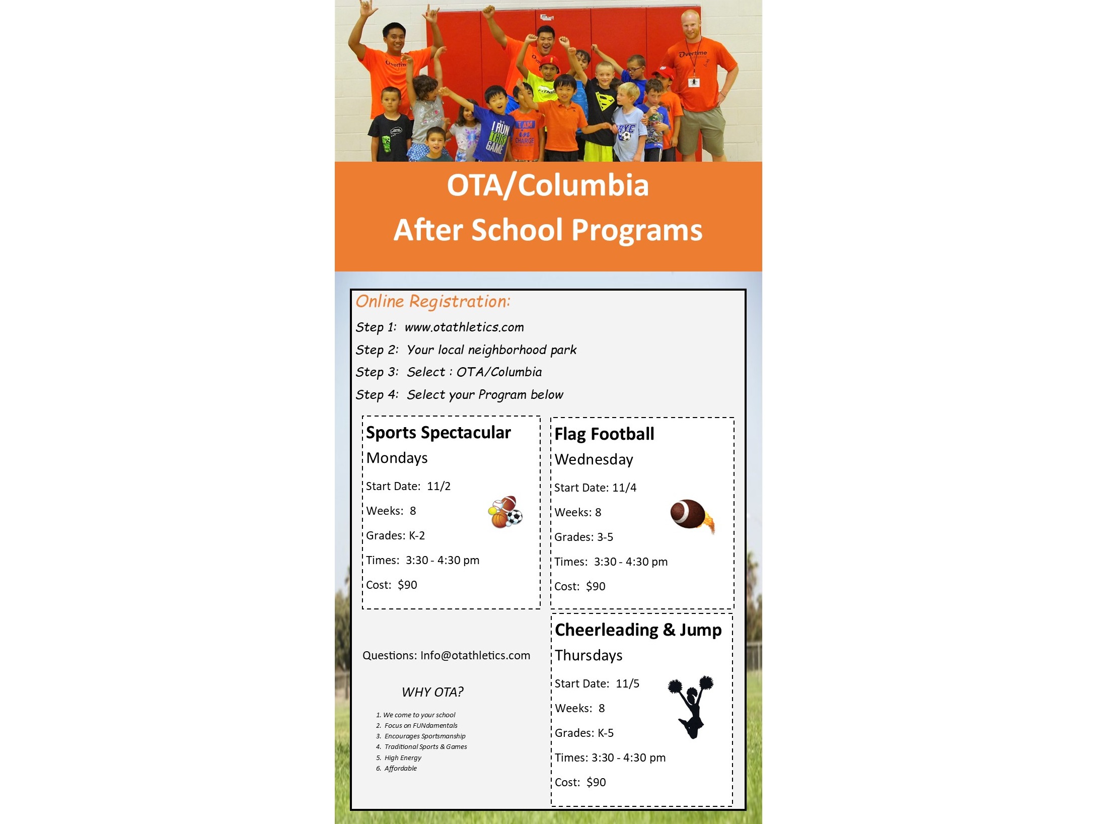 Let’s Play! Save the best for last by finishing up the school day with Sports Spectacular, a variety athletic program that features different sports throughout the session. Participants will practice skills and play games in both traditional sports and playground favorites. The Sports Spectacular Variety Program features the best “to-do” list ever – Basketball, Soccer, Flag Football, Kickball, Capture the Flag, Wiffle Ball, Bump and Bite, Knights and Dragons, Numbers Game, Tag Games, Safe Base and MORE! OTA covers all the bases with our emphasis on playing, teamwork, sportsmanship, and fitness. Don’t miss out on the FUN!